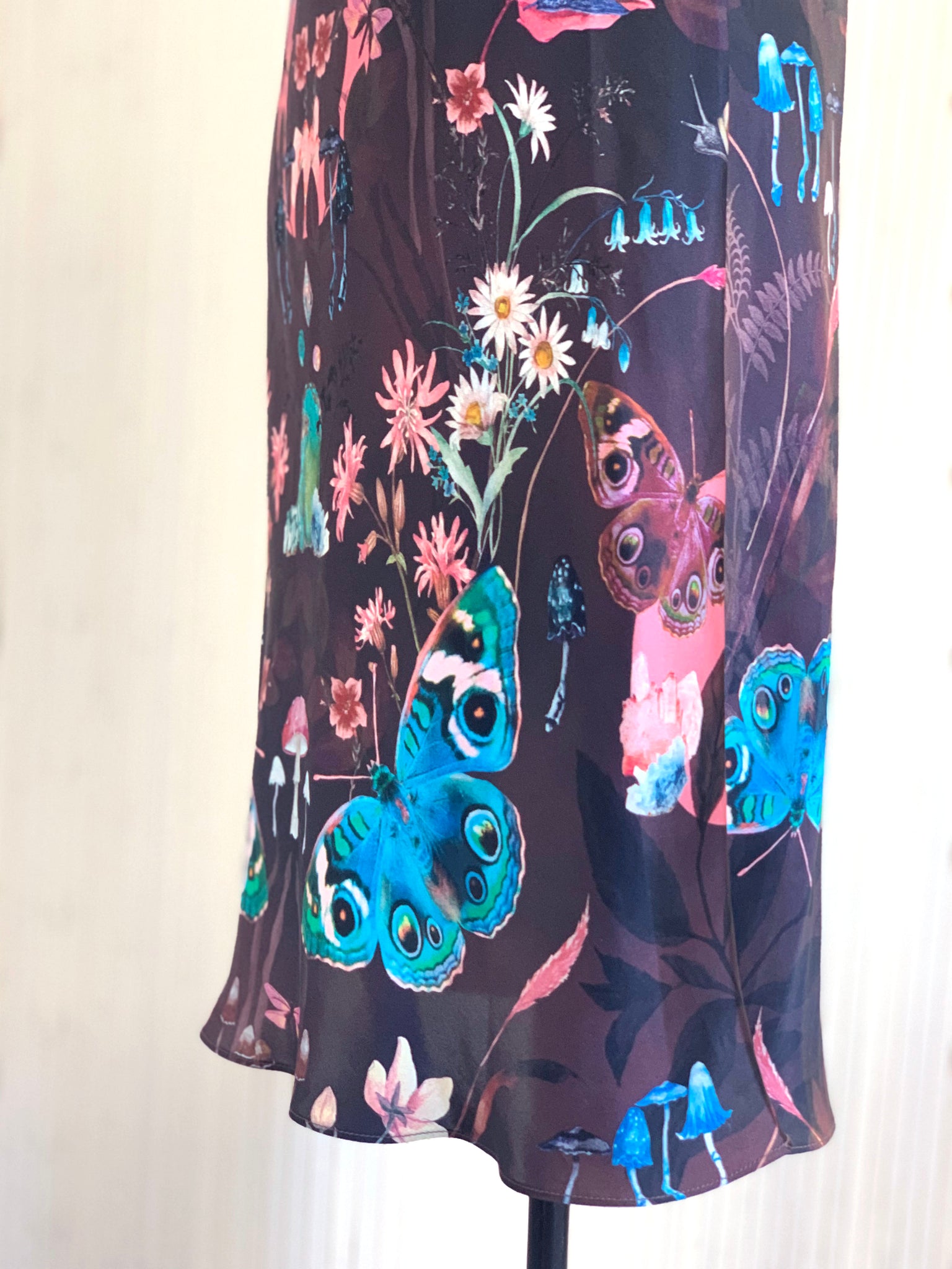 Feel connected to nature with original hand painted artwork inspired by all of natures amazing creations. Butterflies dance around the botanicals, crystals, mushrooms and all things grown from the ground are payed homage to in the brand new 'Nectar' print. The unique print design has been ‘placed’ on the garment, a technique which makes sure each dress has the same look.