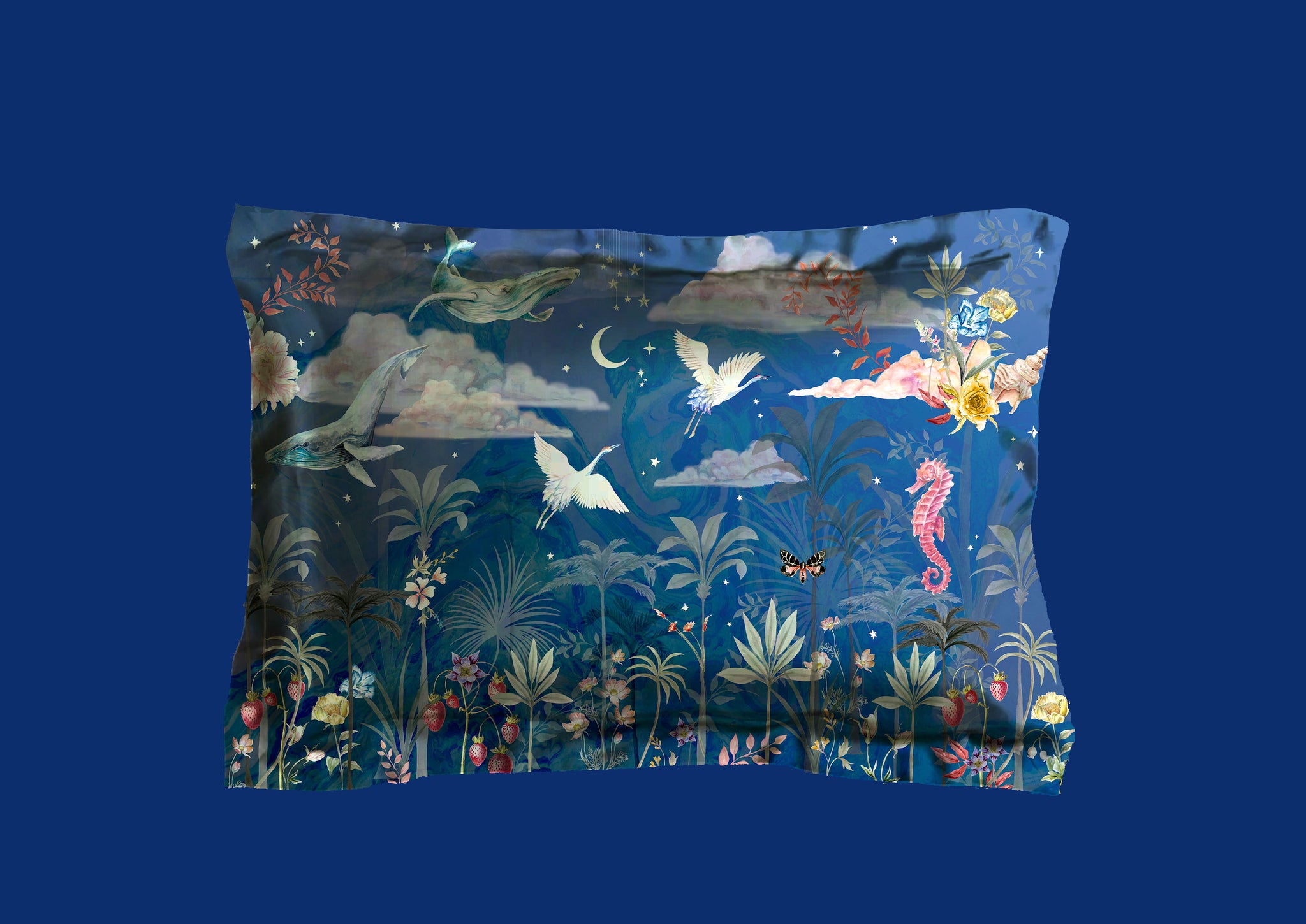 The gorgeous hand painted ‘Wonderous’ print that you already love is now available as a Silk Pillowcase. Whales, birds and seahorses, dance among stars and clouds on this Oxford style cover made from 100% silk natural fibres.